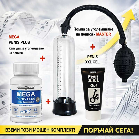 В комплекта ще намерите най-добрата пенис помпа, която ще Ви помогне да постигнете по-твърда и удължена ерекция, заедно с гел за увеличаване размера на пениса, който действа директно върху тъканите и помага да се увеличи дължината и обиколката на пениса. Но това не е всичко! Комплектът включва и таблетки Mega Penis Plus, които ще Ви помогнат да подобрите кръвообращението в областта на пениса и да ускорите растежа му.